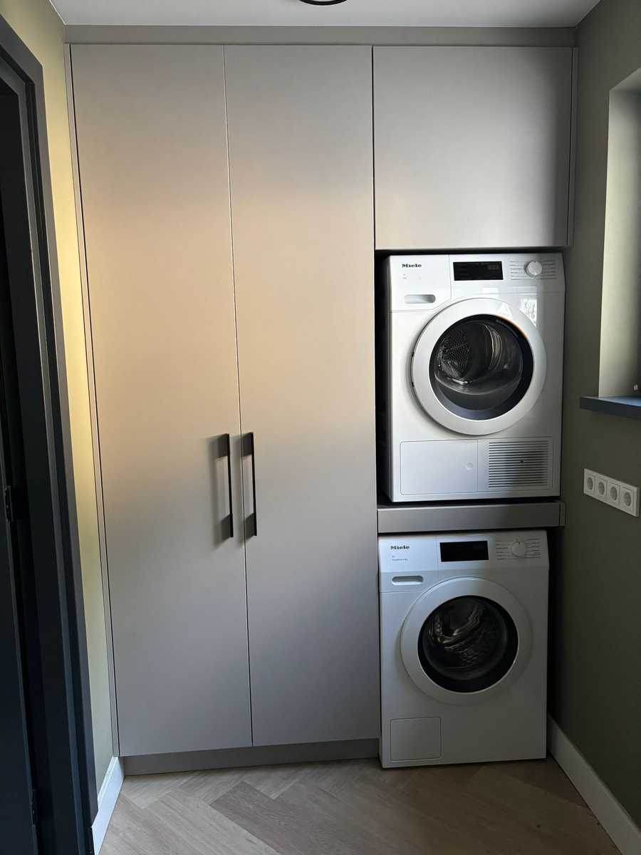 In deze vrijstaande woning hebben we dat principe tot in detail toegepast. De maatwerk keuken vormt een echte eyecatcher: stijlvol, doordacht en voorzien van een bijpassende kastenwand die zorgt voor rust en eenheid. In de waskamer hebben we praktische inbouwkasten gerealiseerd, die perfect aansluiten op het dagelijks gebruik, zonder in te leveren op uitstraling. Door het hele huis heen is de interieurbouw doorgetrokken, waardoor iedere ruimte een eigen sfeer heeft, maar alles samenkomt in één harmonieus geheel.