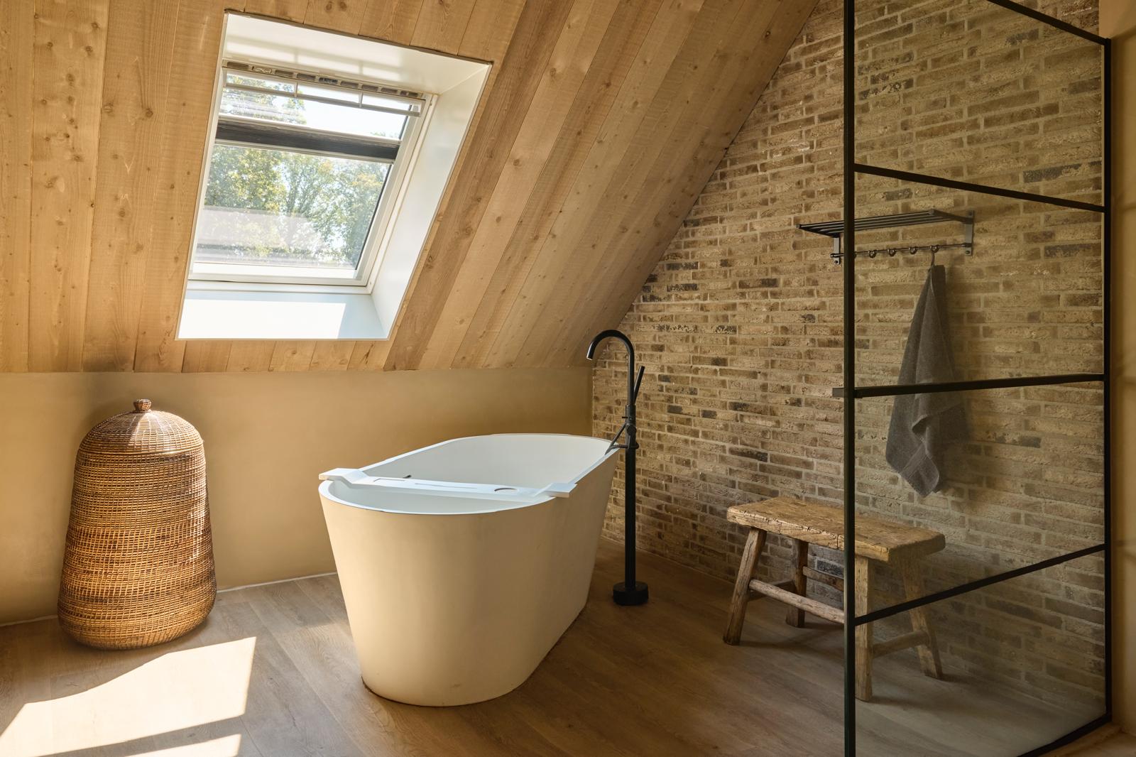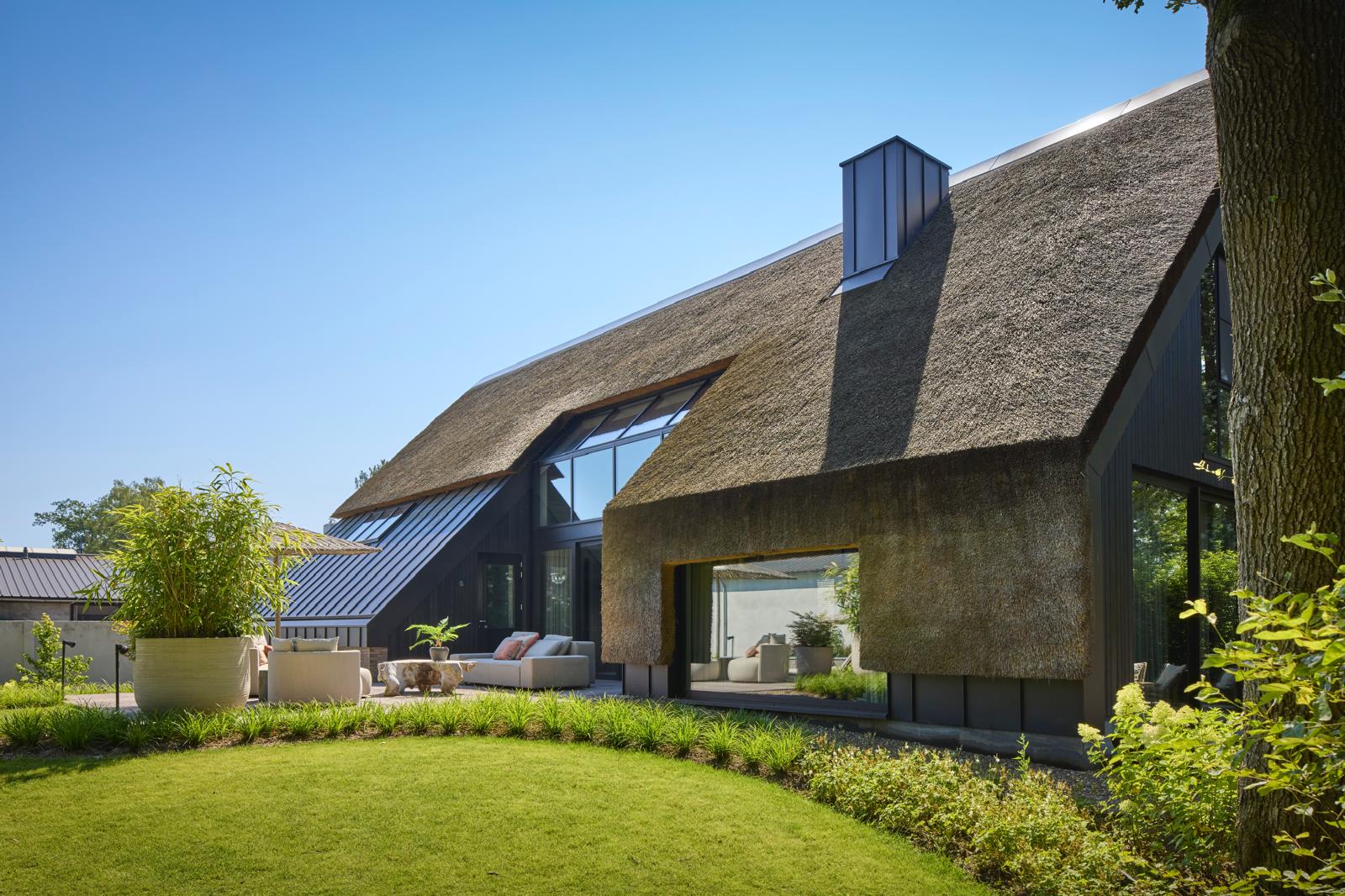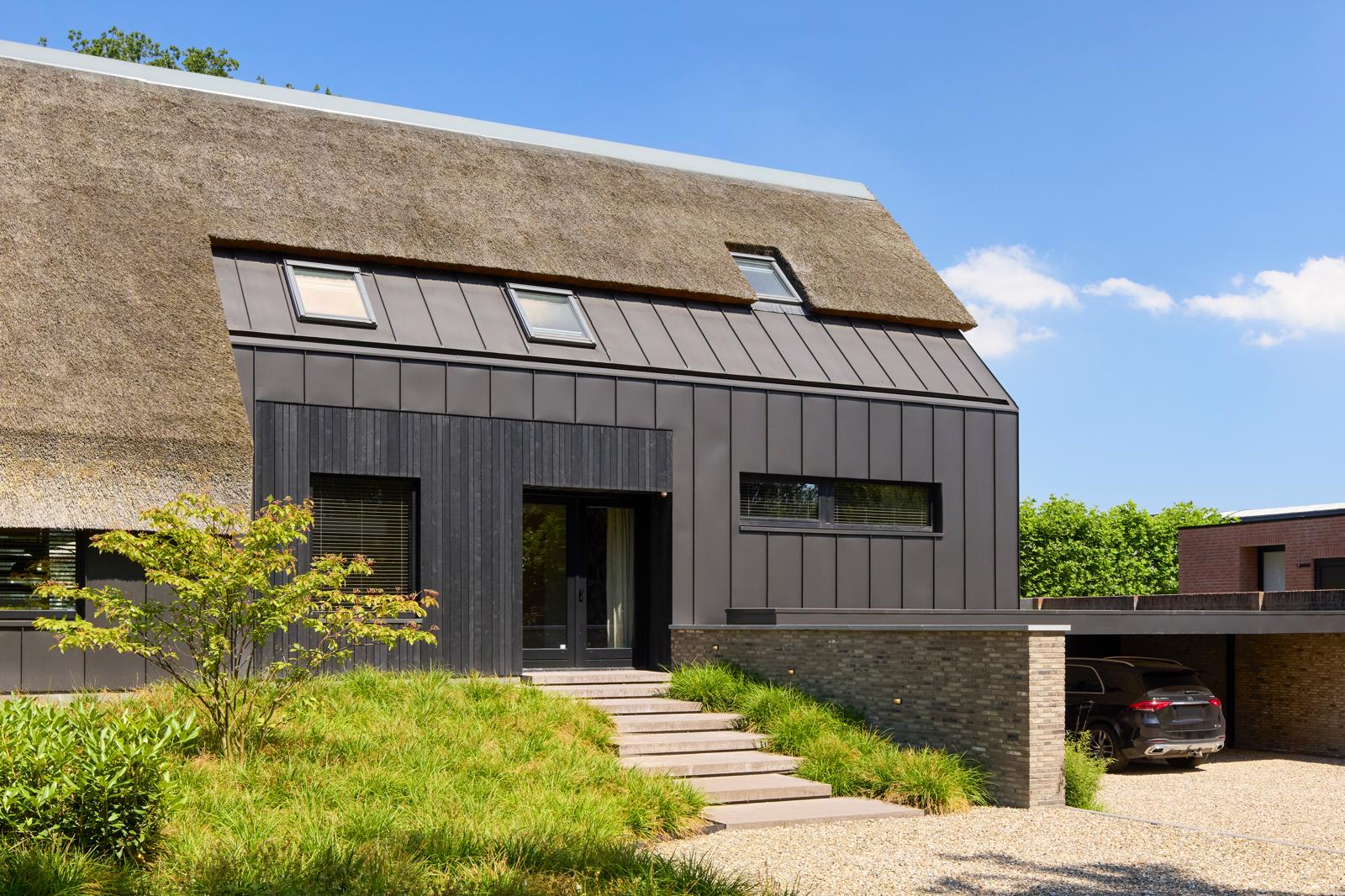 Wij hebben de zwarte buitenwanden gemaakt van gemodificeerd hout, wat de woning een krachtige, moderne uitstraling geeft. Dit duurzame materiaal is onderhoudsarm en behoudt jarenlang zijn natuurlijke schoonheid. Het contrast tussen het donkere hout, de strakke lijnen en het natuurlijke rieten dak zorgt voor een harmonieus geheel vol karakter.